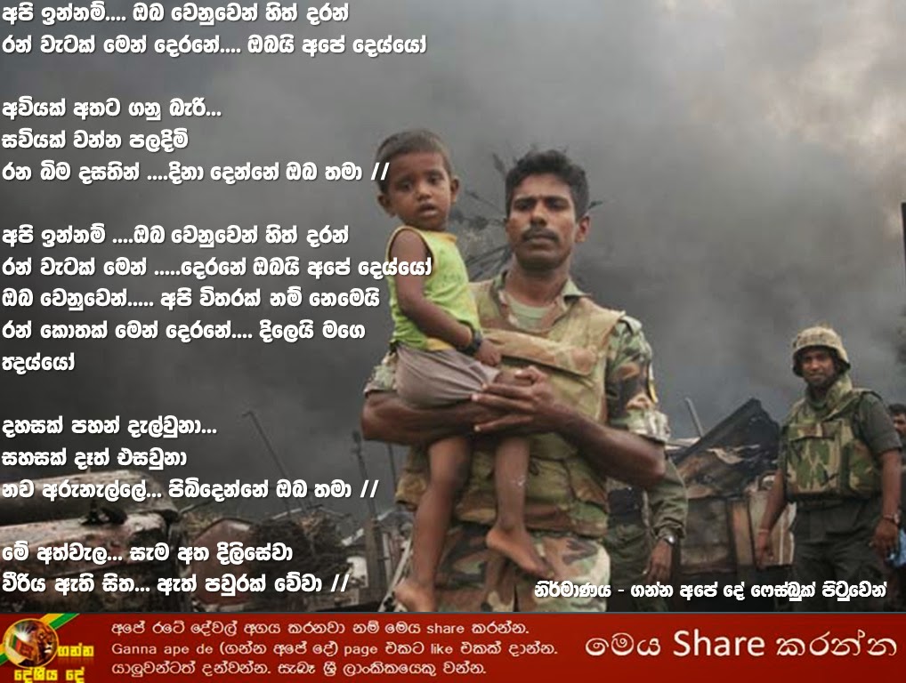 "අපි වෙනුවෙන් අපි" එහෙම කියපු කාලයකුත් තිබුන මතකද ? - Api Wenuwen Api song අපි වෙනුවෙන් අපි , by Iraj (SRI LANKA FORCES)අපේ රට වෙනුවෙන් අපි වෙනුවෙන් අනාගත පරපුර වෙනුවෙන් අත පය ඇස් මස් ලේ විතරක් නෙවෙයි අපි මේ තරම් පරිස්සම් කරන පන ටිකත් දන් දුන්නු ඒ උතුම් රණවිරුවන් වෙනුවෙන් අපි කැපවුණු යුගයක් තිබුනා මතකද ? ඒ රණවිරුවන් වෙනුවෙන් ජය ගී ගයපු හන්දියක් හන්දියක් ගානේ කිරිබත් උයපු ප්රීති ගෝෂා නගපු ලයිට් කණුවක් කණුවක් ගානේ රණවිරුවන්ට ස්තුති කරලා බැනර් දාපු ඒ අතීතය මතකද ?